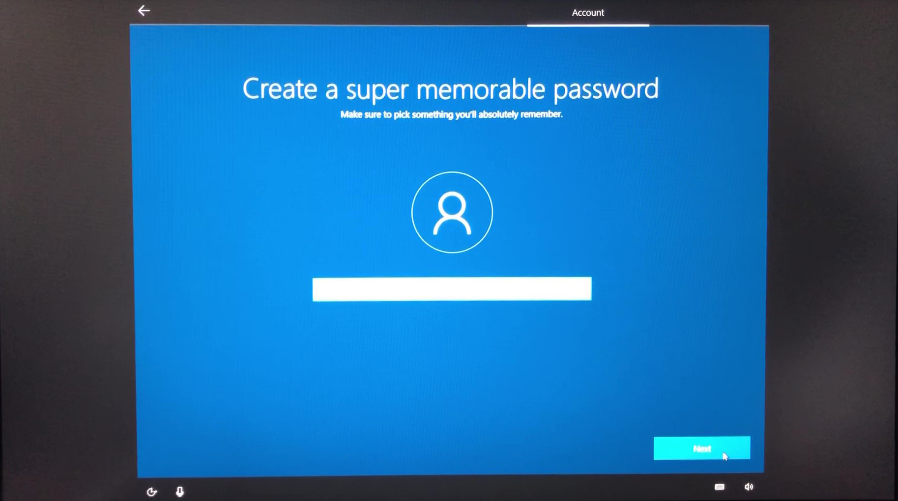 Create the first user, which will be the "administrator" of the computer (have full rights to do things). You can't select the name "Administrator" (it's already in Windows, but disabled). Search the internet for names NOT to use (like root or admin), as they will be popular to attack. Select something meaningful to you or your business.