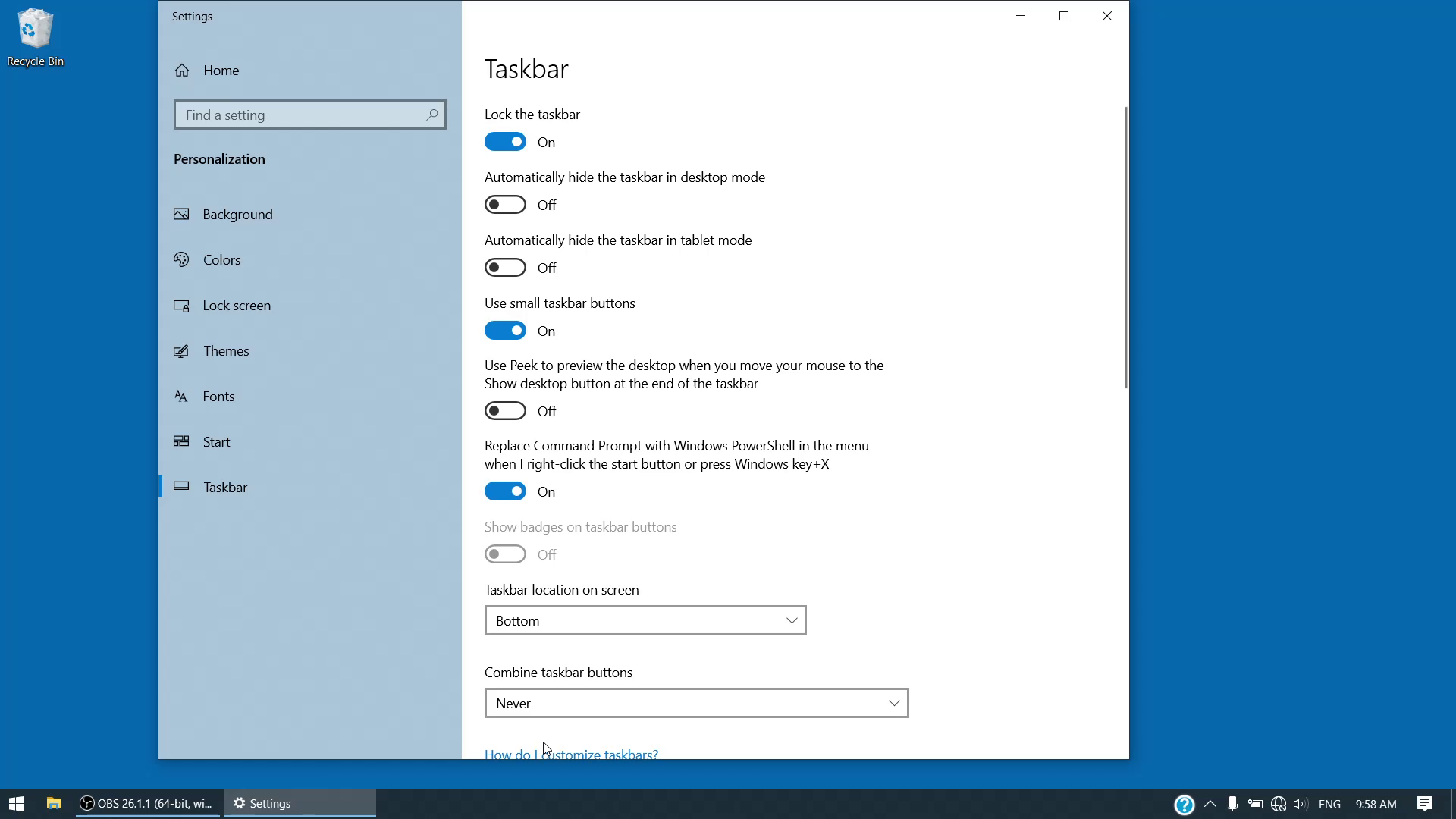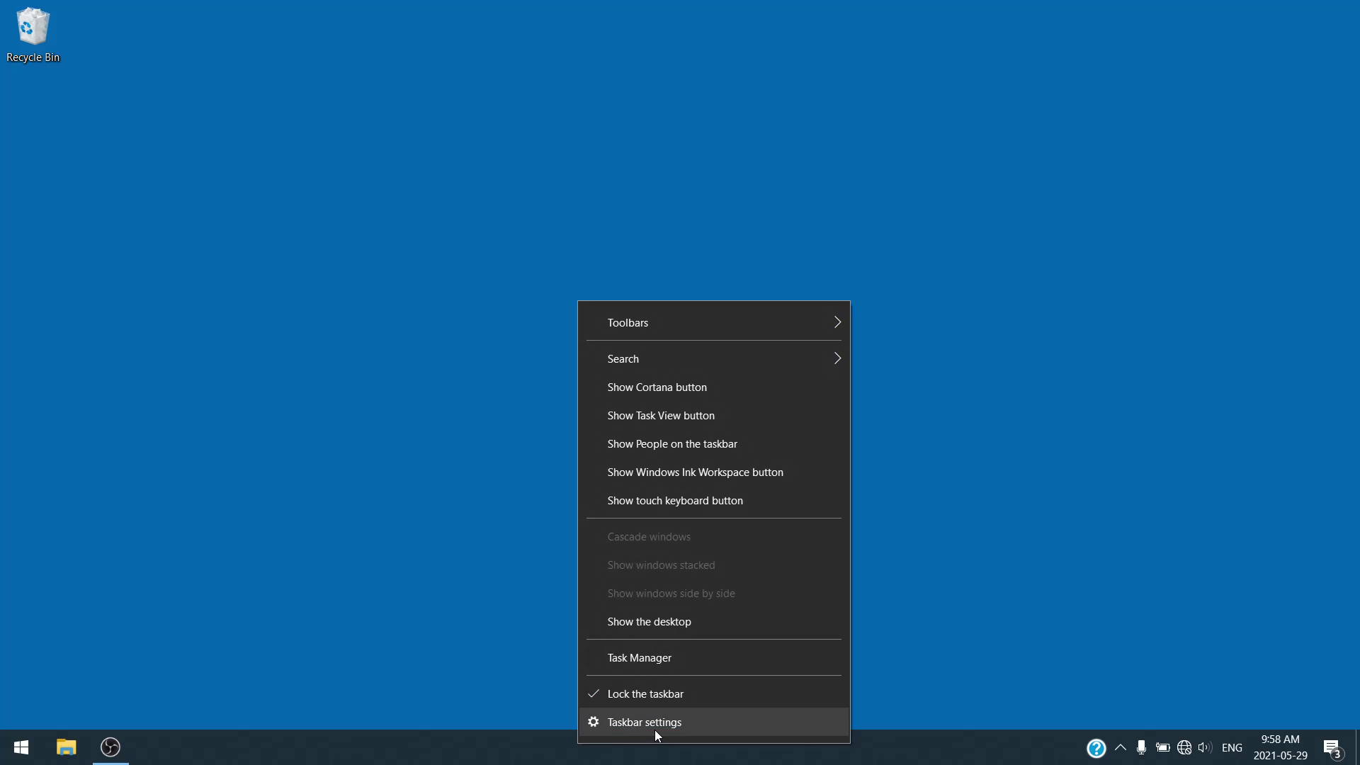 I remove pinned icons along the bottom taskbar, and turn off Search, Show Cortana, Show TaskView, News & Interests so that just the Start button and the File Explorer are left.
