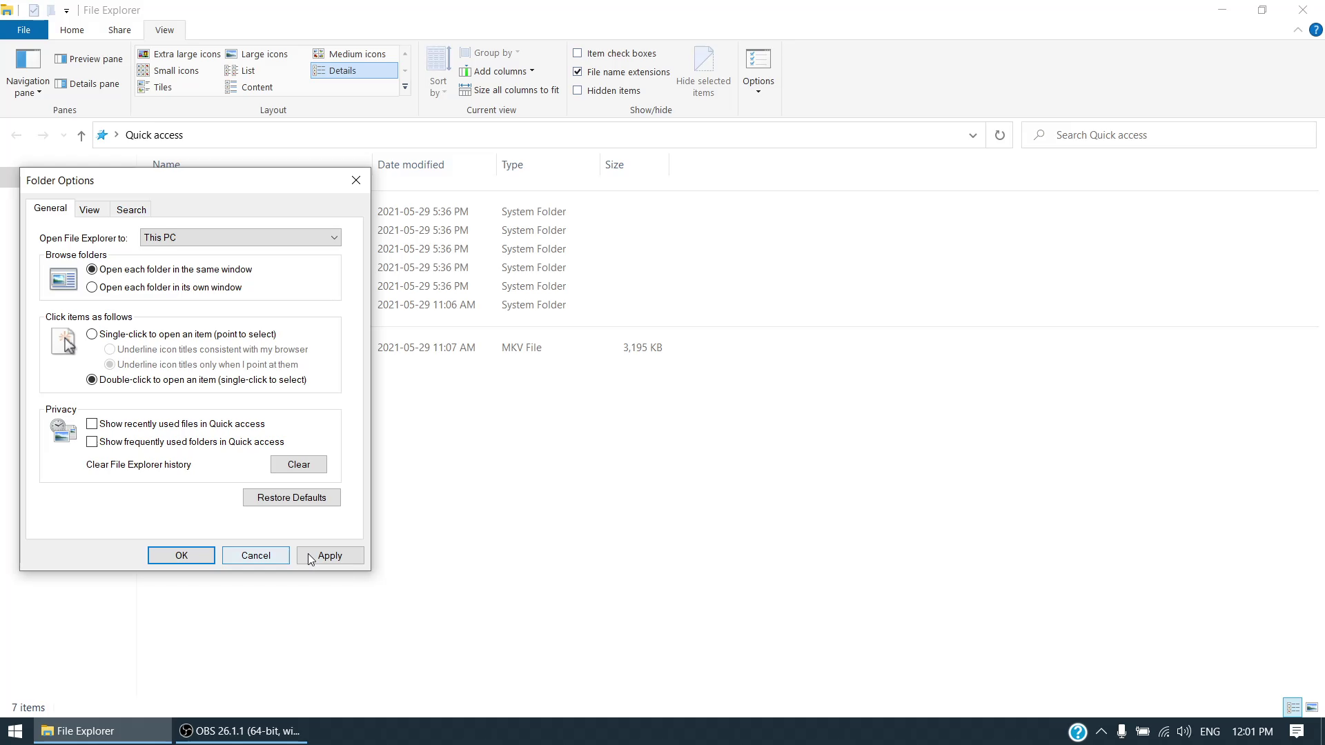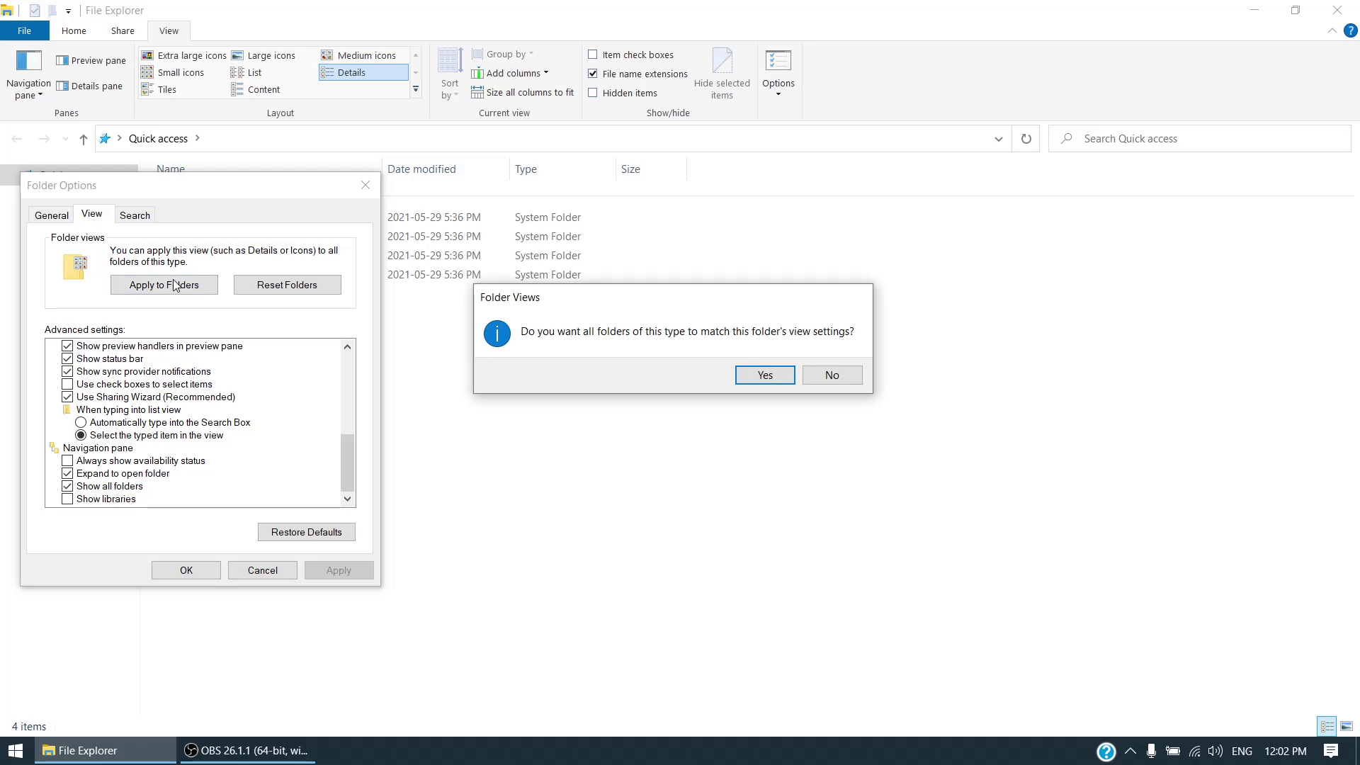 I select the Details View and Show File Name Extensions and set the Folder Options.