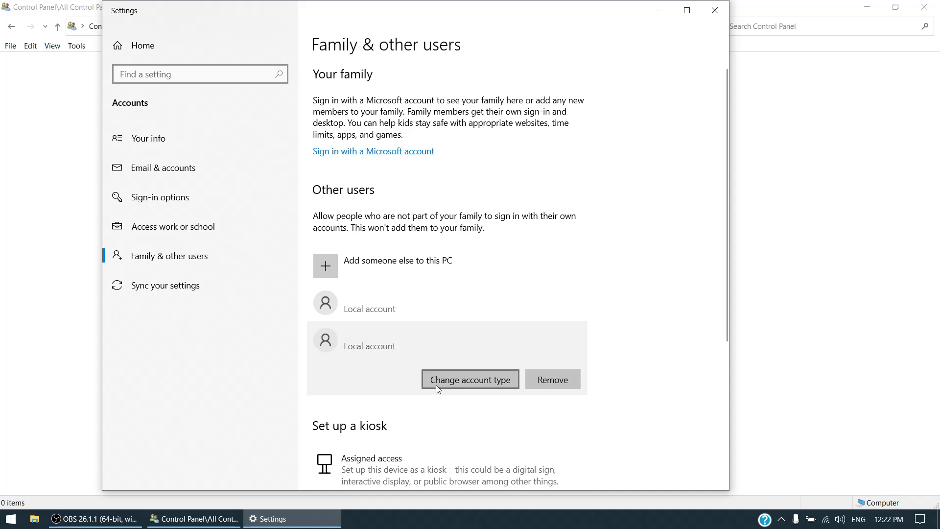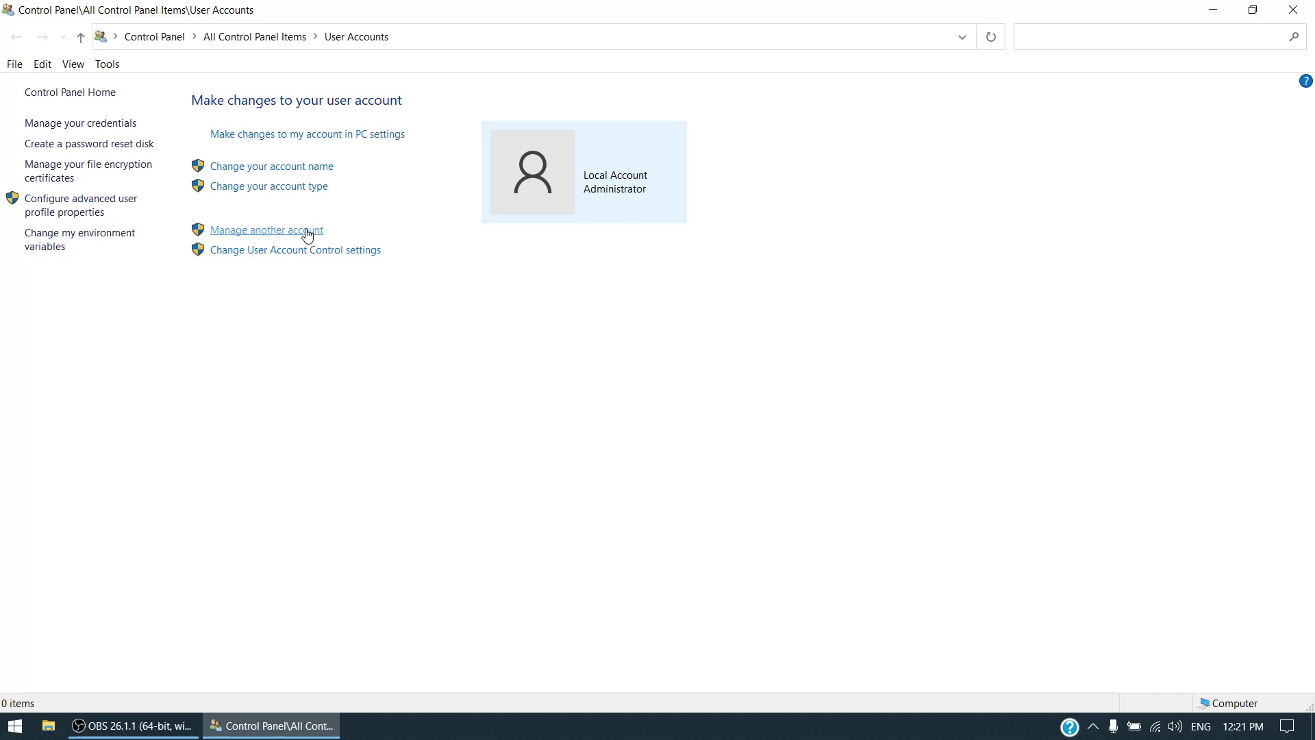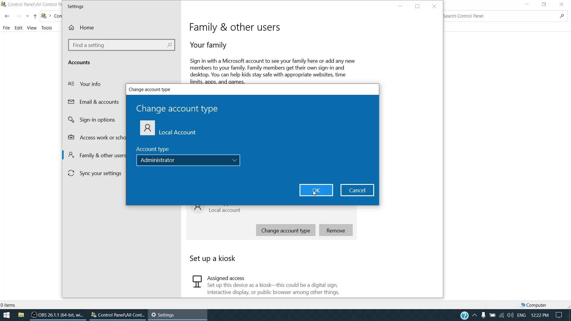 For this 2nd Administrator account, change the account type to Administrator from User.