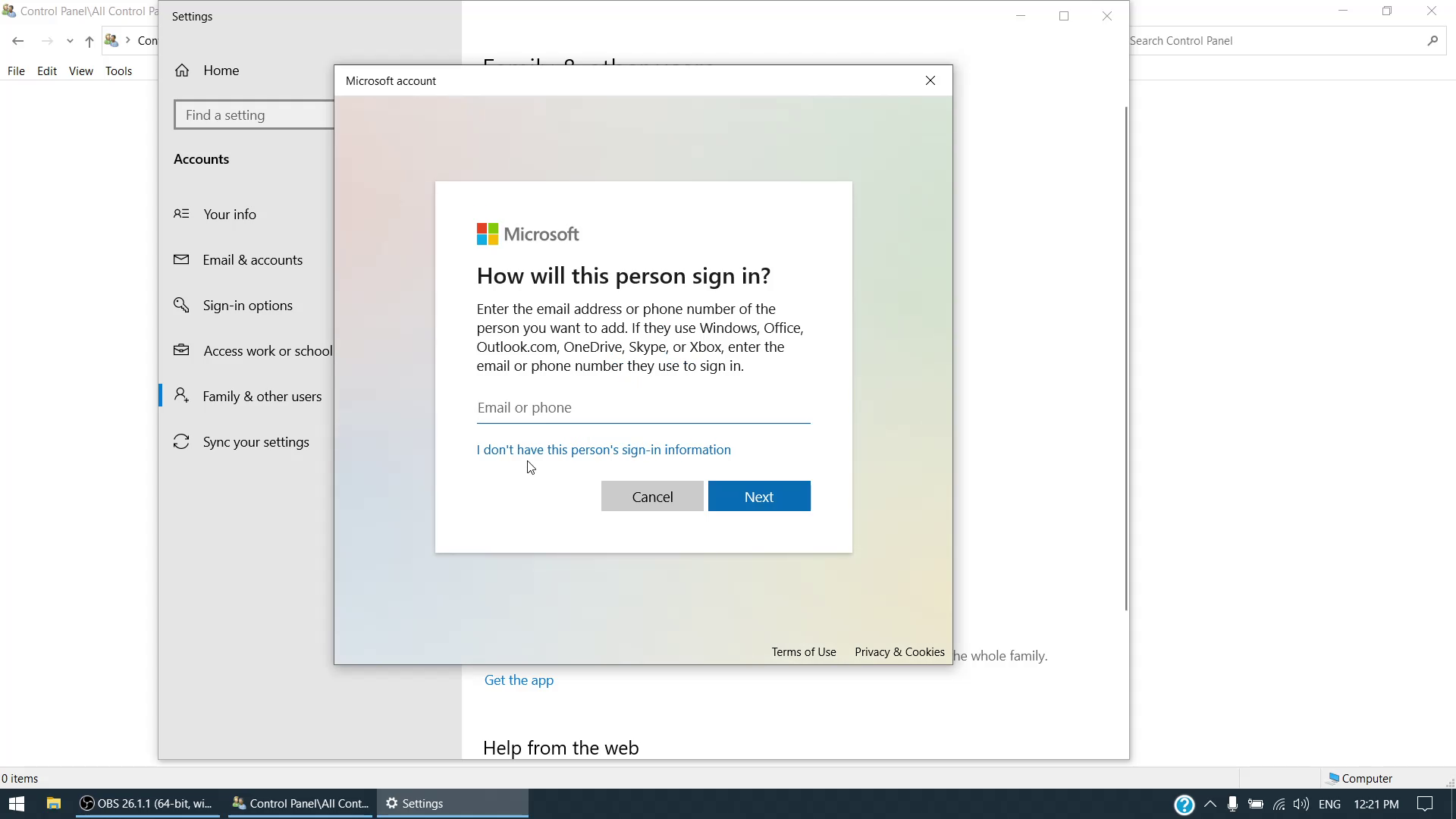 We don't want it to be a Microsoft account, so select "I don't have this person's sign-in information".