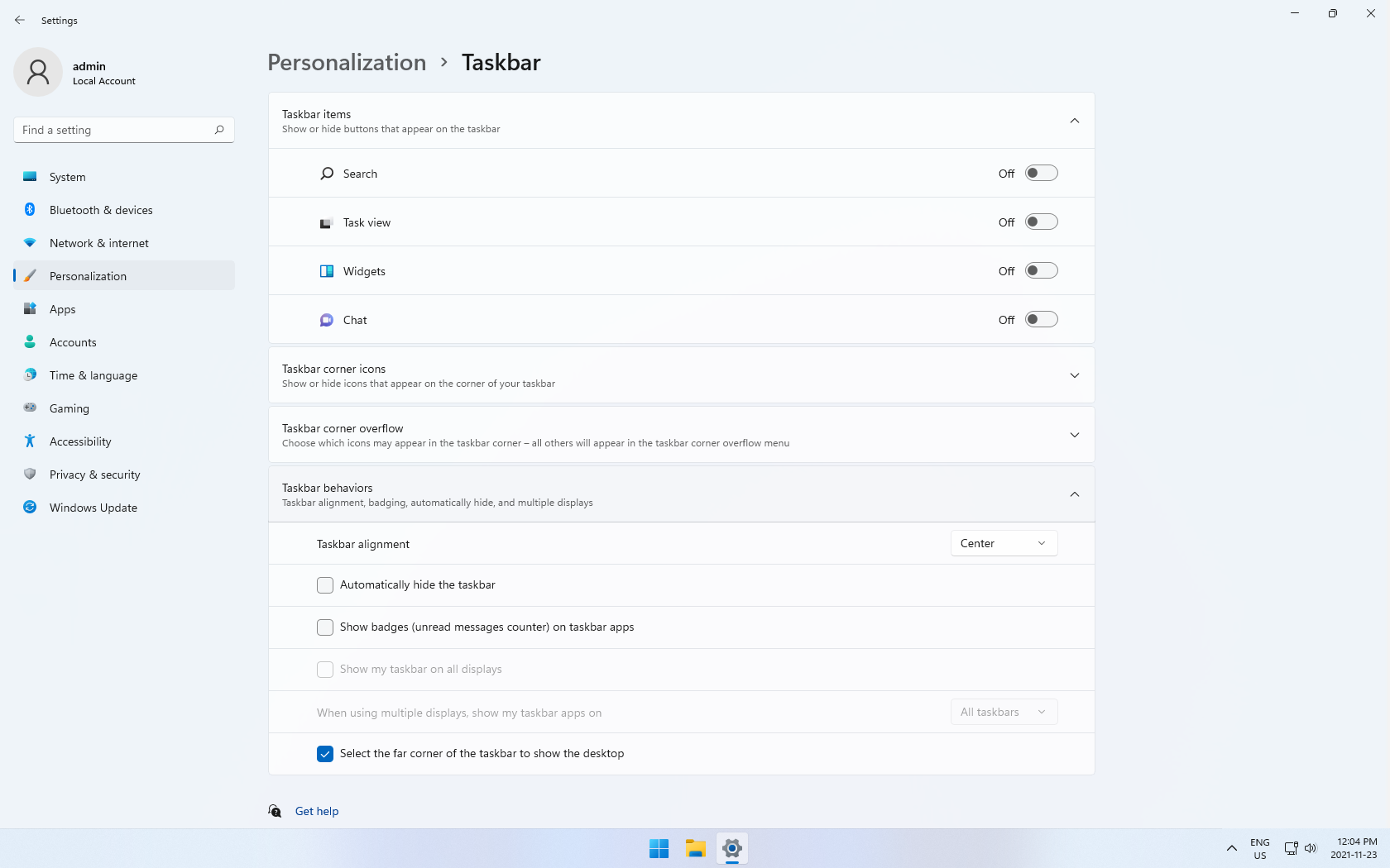 Set the standard look for the computer (when logged in as the administrator) for easier troubleshooting when dealing with many computers. I also set the background to a solid colour (not shown).