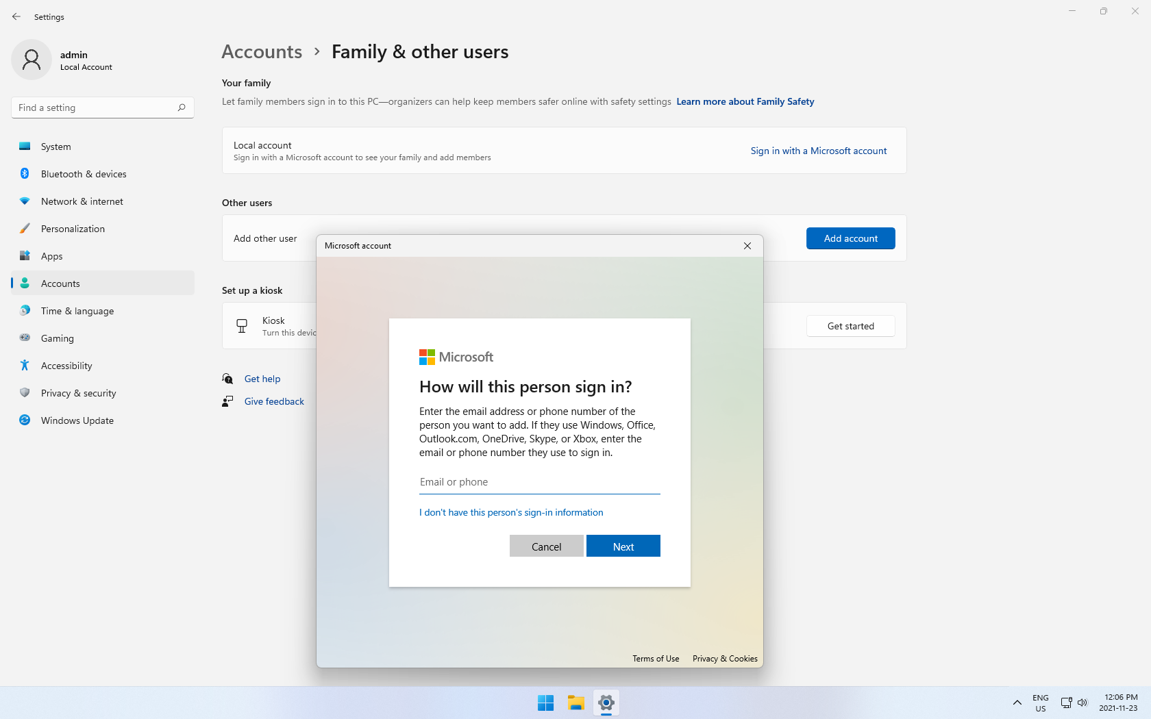 We don't want it to be a Microsoft account, so select "I don't have this person's sign-in information".