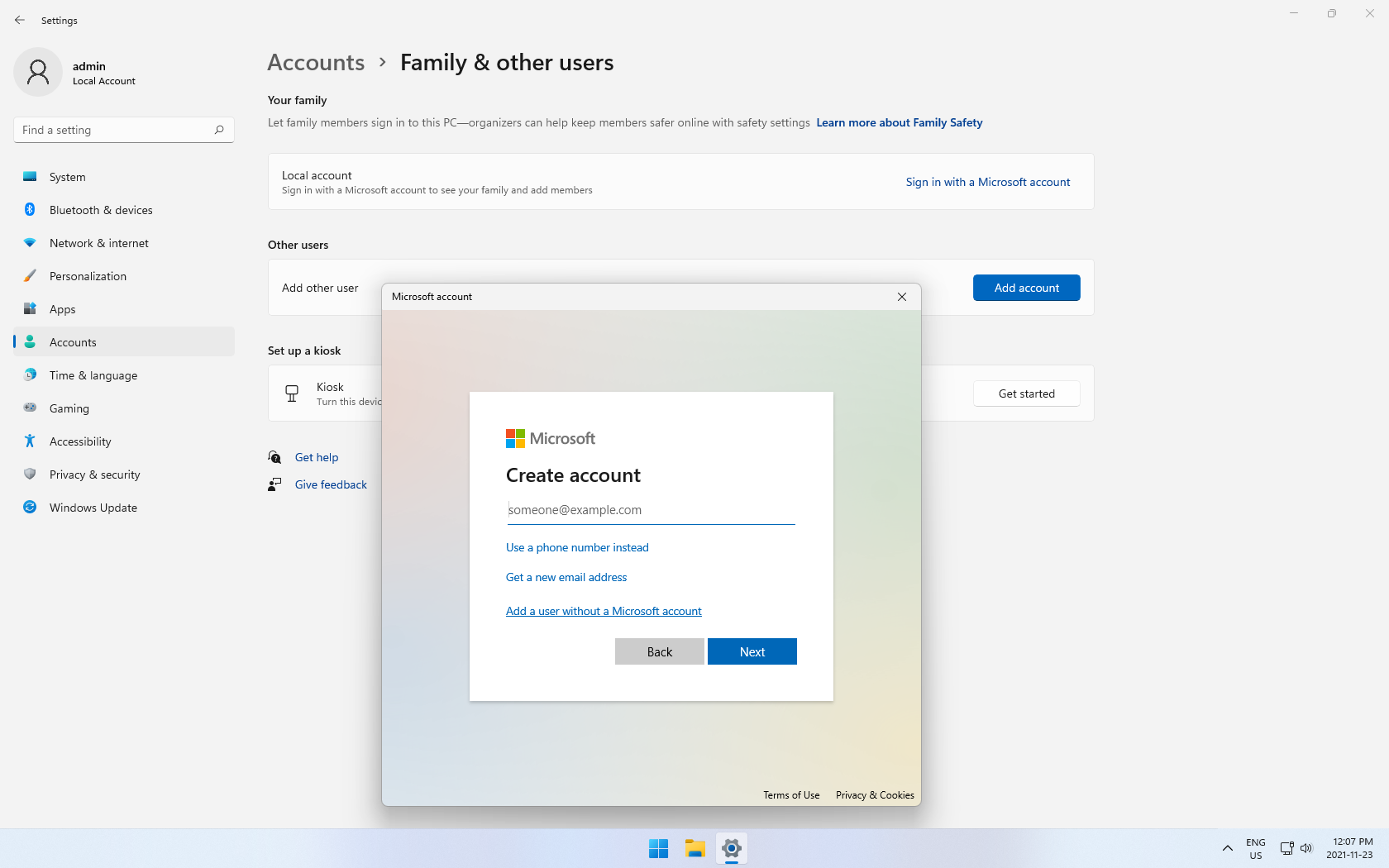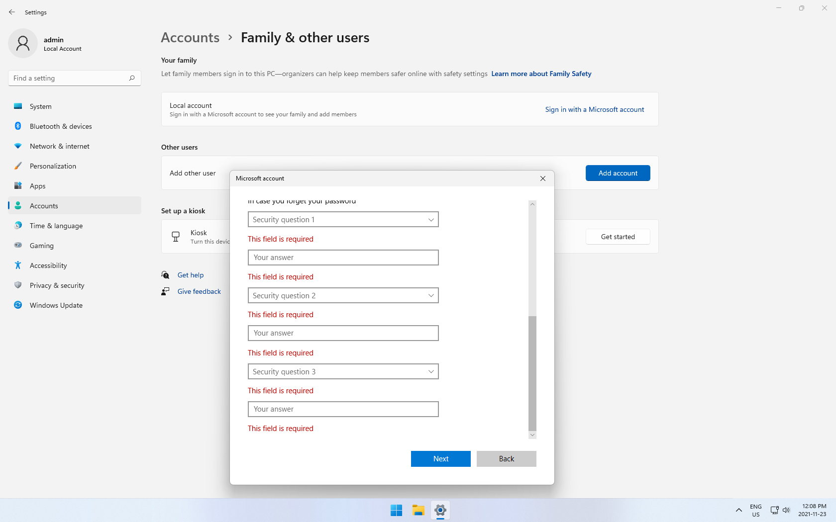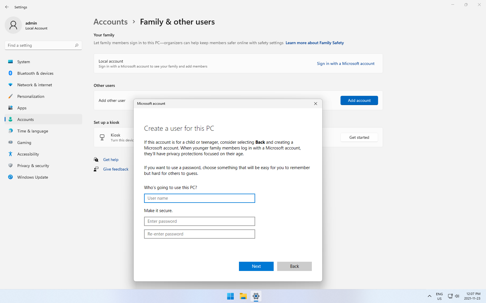 ***Note 2 *** If you are using Microsoft products (Office, Onedrive, Teams), you may want to tie the user to a Microsoft account for easier login management. (it's not necessary though).
