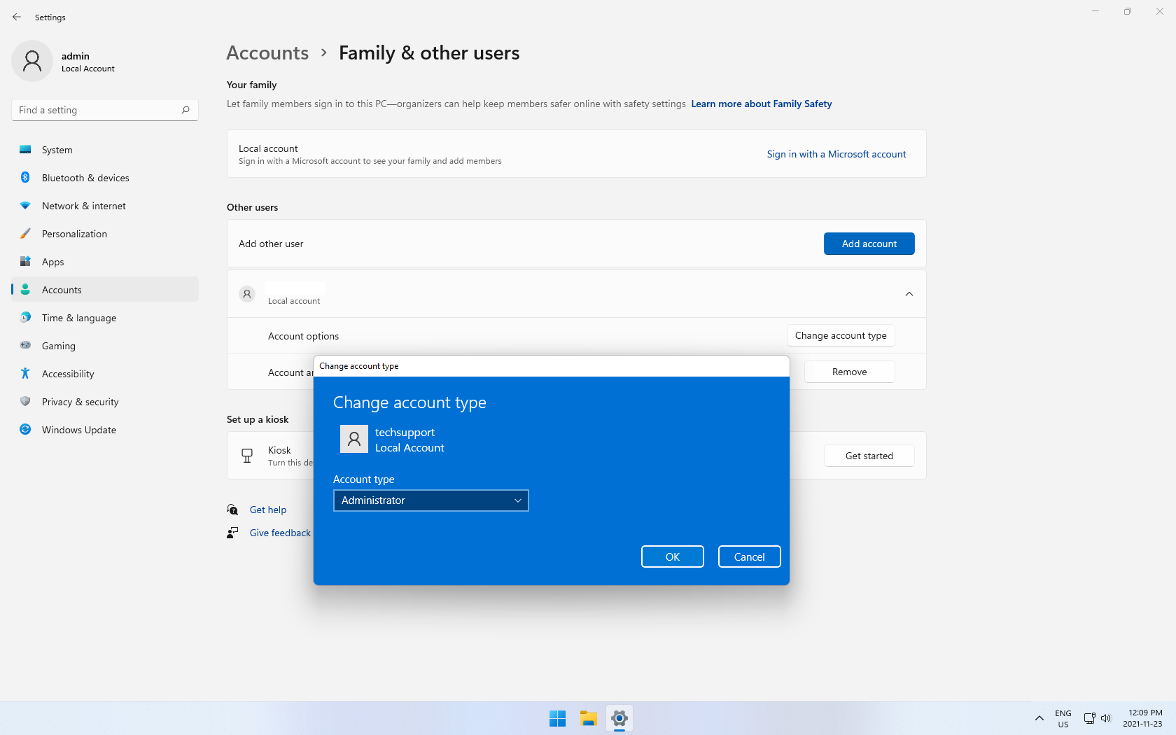 For this 2nd Administrator account, change the account type to Administrator from User.